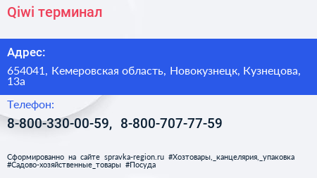 Qiwi, терминал по адресу 654041, Кемеровская область, Новокузнецк, Кузнецова, 13а в дальнейшем Организация, размещена в следующих категориях: