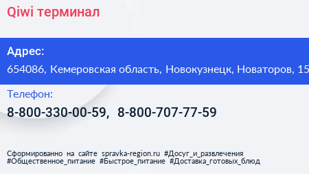 Qiwi, терминал по адресу 654086, Кемеровская область, Новокузнецк, Новаторов, 15 в дальнейшем Организация, размещена в следующих категориях: