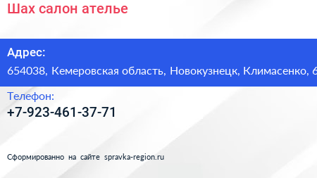 Шах, салон-ателье по адресу 654038, Кемеровская область, Новокузнецк, Климасенко, 6 в дальнейшем Организация, размещена в следующих категориях:
