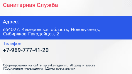 Санитарная Служба по адресу 654027, Кемеровская область, Новокузнецк, Сибиряков-Гвардейцев, 2 в дальнейшем Организация, размещена в следующих категориях: