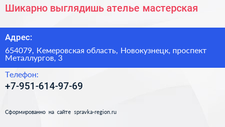 Шикарно выглядишь!, ателье-мастерская по адресу 654079, Кемеровская область, Новокузнецк, проспект Металлургов, 3 в дальнейшем Организация, размещена в следующих категориях: