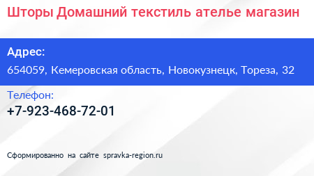 Шторы-Домашний текстиль, ателье-магазин по адресу 654059, Кемеровская область, Новокузнецк, Тореза, 32 в дальнейшем Организация, размещена в следующих категориях: