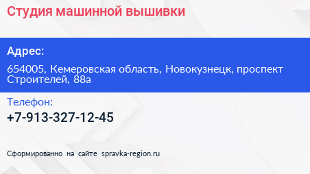 Студия машинной вышивки по адресу 654005, Кемеровская область, Новокузнецк, проспект Строителей, 88а в дальнейшем Организация, размещена в следующих категориях:
