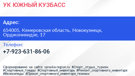 УК ЮЖНЫЙ КУЗБАСС по адресу 654005, Кемеровская область, Новокузнецк, Орджоникидзе, 17 в дальнейшем Организация, размещена в следующих категориях: