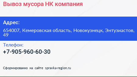 Вывоз мусора-НК, компания по адресу 654007, Кемеровская область, Новокузнецк, Энтузиастов, 49 в дальнейшем Организация, размещена в следующих категориях: