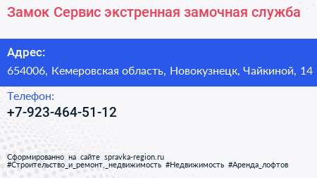 Замок-Сервис, экстренная замочная служба по адресу 654006, Кемеровская область, Новокузнецк, Чайкиной, 14 в дальнейшем Организация, размещена в следующих категориях: