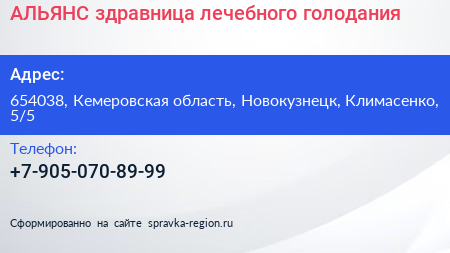 АЛЬЯНС, здравница лечебного голодания по адресу 654038, Кемеровская область, Новокузнецк, Климасенко, 5/5 в дальнейшем Организация, размещена в следующих категориях: