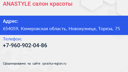 ANASTYLE, салон красоты по адресу 654059, Кемеровская область, Новокузнецк, Тореза, 75 в дальнейшем Организация, размещена в следующих категориях:
