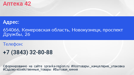 Аптека 42+ по адресу 654066, Кемеровская область, Новокузнецк, проспект Дружбы, 26 в дальнейшем Организация, размещена в следующих категориях: