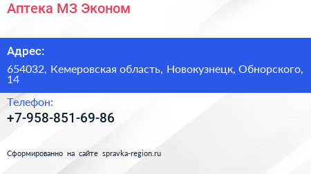Аптека МЗ Эконом по адресу 654032, Кемеровская область, Новокузнецк, Обнорского, 14 в дальнейшем Организация, размещена в следующих категориях:
