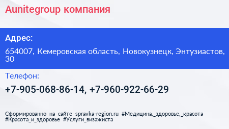 Aunitegroup, компания по адресу 654007, Кемеровская область, Новокузнецк, Энтузиастов, 30 в дальнейшем Организация, размещена в следующих категориях: