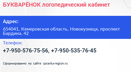 БУКВАРЁНОК, логопедический кабинет по адресу 654041, Кемеровская область, Новокузнецк, проспект Бардина, 42 в дальнейшем Организация, размещена в следующих категориях: