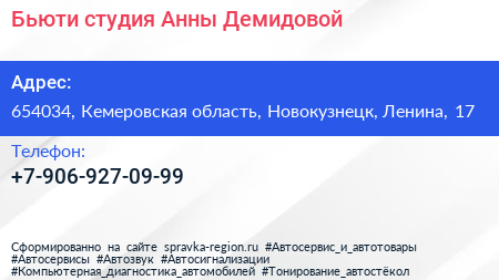 Бьюти-студия Анны Демидовой по адресу 654034, Кемеровская область, Новокузнецк, Ленина, 17 в дальнейшем Организация, размещена в следующих категориях: