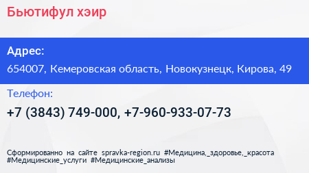 Бьютифул хэир по адресу 654007, Кемеровская область, Новокузнецк, Кирова, 49 в дальнейшем Организация, размещена в следующих категориях: