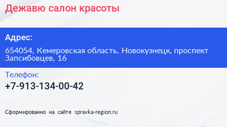 Дежавю, салон красоты по адресу 654054, Кемеровская область, Новокузнецк, проспект Запсибовцев, 16 в дальнейшем Организация, размещена в следующих категориях: