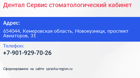 Дентал Сервис, стоматологический кабинет по адресу 654044, Кемеровская область, Новокузнецк, проспект Авиаторов, 31 в дальнейшем Организация, размещена в следующих категориях:
