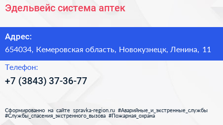 Эдельвейс, система аптек по адресу 654034, Кемеровская область, Новокузнецк, Ленина, 11 в дальнейшем Организация, размещена в следующих категориях: