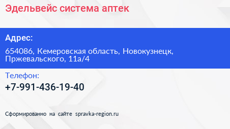 Эдельвейс, система аптек по адресу 654086, Кемеровская область, Новокузнецк, Пржевальского, 11а/4 в дальнейшем Организация, размещена в следующих категориях:
