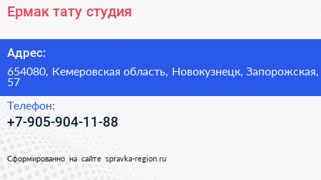 Ермак, тату-студия по адресу 654080, Кемеровская область, Новокузнецк, Запорожская, 57 в дальнейшем Организация, размещена в следующих категориях: