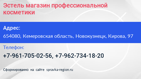 Эстель, магазин профессиональной косметики по адресу 654080, Кемеровская область, Новокузнецк, Кирова, 97 в дальнейшем Организация, размещена в следующих категориях: