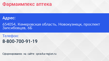 Фармаимпекс, аптека по адресу 654054, Кемеровская область, Новокузнецк, проспект Запсибовцев, 6Б в дальнейшем Организация, размещена в следующих категориях: