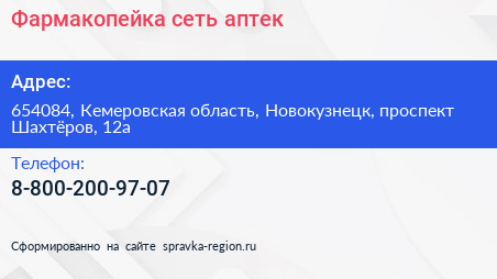 Фармакопейка, сеть аптек по адресу 654084, Кемеровская область, Новокузнецк, проспект Шахтёров, 12а в дальнейшем Организация, размещена в следующих категориях: