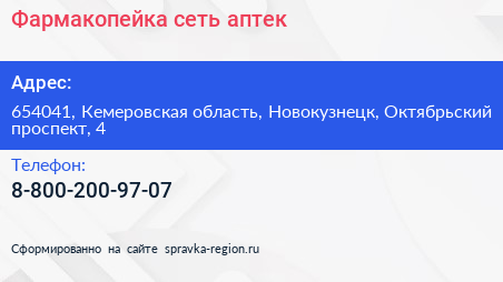 Фармакопейка, сеть аптек по адресу 654041, Кемеровская область, Новокузнецк, Октябрьский проспект, 4 в дальнейшем Организация, размещена в следующих категориях: