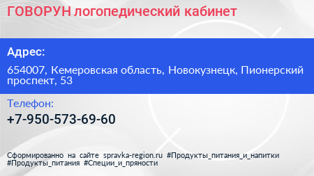 ГОВОРУН, логопедический кабинет по адресу 654007, Кемеровская область, Новокузнецк, Пионерский проспект, 53 в дальнейшем Организация, размещена в следующих категориях: