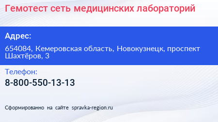 Гемотест, сеть медицинских лабораторий по адресу 654084, Кемеровская область, Новокузнецк, проспект Шахтёров, 3 в дальнейшем Организация, размещена в следующих категориях: