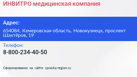 ИНВИТРО, медицинская компания по адресу 654084, Кемеровская область, Новокузнецк, проспект Шахтёров, 19 в дальнейшем Организация, размещена в следующих категориях:
