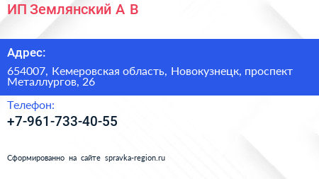 ИП Землянский А.В. по адресу 654007, Кемеровская область, Новокузнецк, проспект Металлургов, 26 в дальнейшем Организация, размещена в следующих категориях: