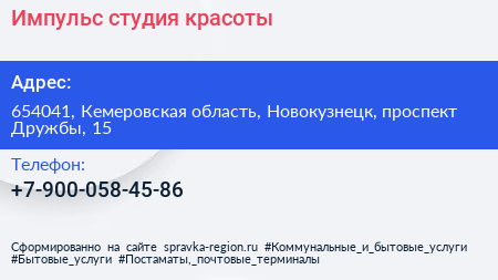 Импульс, студия красоты по адресу 654041, Кемеровская область, Новокузнецк, проспект Дружбы, 15 в дальнейшем Организация, размещена в следующих категориях: