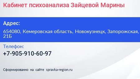 Кабинет психоанализа Зайцевой Марины по адресу 654080, Кемеровская область, Новокузнецк, Запорожская, 21Б в дальнейшем Организация, размещена в следующих категориях: