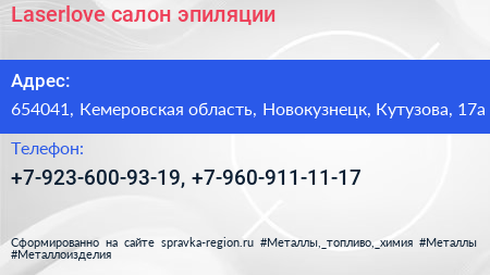 Laserlove, салон эпиляции по адресу 654041, Кемеровская область, Новокузнецк, Кутузова, 17а в дальнейшем Организация, размещена в следующих категориях: