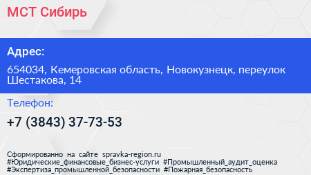 МСТ-Сибирь по адресу 654034, Кемеровская область, Новокузнецк, переулок Шестакова, 14 в дальнейшем Организация, размещена в следующих категориях: