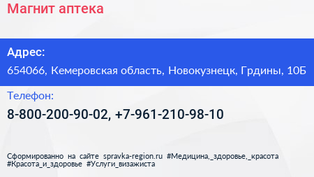 Магнит, аптека по адресу 654066, Кемеровская область, Новокузнецк, Грдины, 10Б в дальнейшем Организация, размещена в следующих категориях: