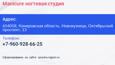 Manicure, ногтевая студия по адресу 654018, Кемеровская область, Новокузнецк, Октябрьский проспект, 13 в дальнейшем Организация, размещена в следующих категориях: