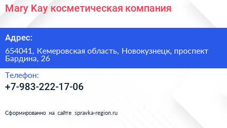 Mary Kay, косметическая компания по адресу 654041, Кемеровская область, Новокузнецк, проспект Бардина, 26 в дальнейшем Организация, размещена в следующих категориях: