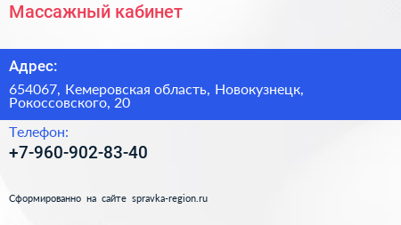 Массажный кабинет по адресу 654067, Кемеровская область, Новокузнецк, Рокоссовского, 20 в дальнейшем Организация, размещена в следующих категориях: