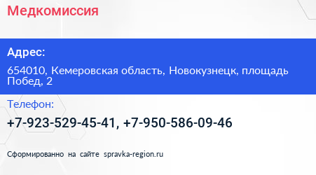 Медкомиссия по адресу 654010, Кемеровская область, Новокузнецк, площадь Побед, 2 в дальнейшем Организация, размещена в следующих категориях: