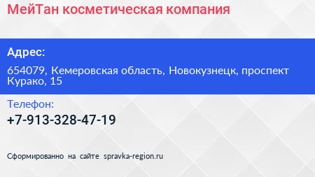 МейТан, косметическая компания по адресу 654079, Кемеровская область, Новокузнецк, проспект Курако, 15 в дальнейшем Организация, размещена в следующих категориях: