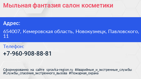 Мыльная фантазия, салон косметики по адресу 654007, Кемеровская область, Новокузнецк, Павловского, 11 в дальнейшем Организация, размещена в следующих категориях: