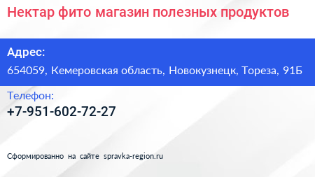 Нектар-фито, магазин полезных продуктов по адресу 654059, Кемеровская область, Новокузнецк, Тореза, 91Б в дальнейшем Организация, размещена в следующих категориях: