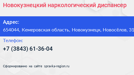 Новокузнецкий наркологический диспансер по адресу 654044, Кемеровская область, Новокузнецк, Новосёлов, 31 в дальнейшем Организация, размещена в следующих категориях: