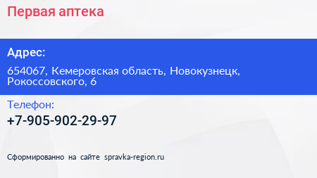 Первая, аптека по адресу 654067, Кемеровская область, Новокузнецк, Рокоссовского, 6 в дальнейшем Организация, размещена в следующих категориях: