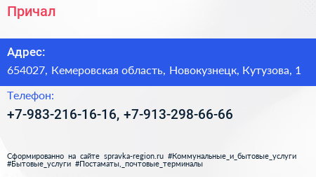 Причал по адресу 654027, Кемеровская область, Новокузнецк, Кутузова, 1 в дальнейшем Организация, размещена в следующих категориях: