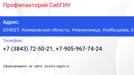 Профилакторий, СибГИУ по адресу 654027, Кемеровская область, Новокузнецк, Куйбышева, 6 в дальнейшем Организация, размещена в следующих категориях: