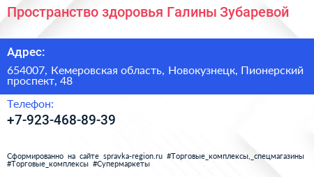 Пространство здоровья Галины Зубаревой по адресу 654007, Кемеровская область, Новокузнецк, Пионерский проспект, 48 в дальнейшем Организация, размещена в следующих категориях: