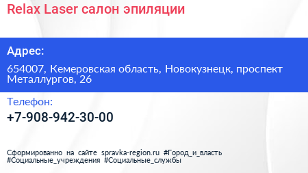 Relax Laser, салон эпиляции по адресу 654007, Кемеровская область, Новокузнецк, проспект Металлургов, 26 в дальнейшем Организация, размещена в следующих категориях: