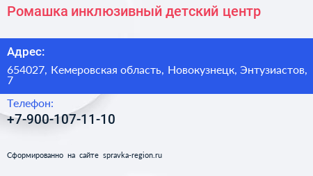 Ромашка, инклюзивный детский центр по адресу 654027, Кемеровская область, Новокузнецк, Энтузиастов, 7 в дальнейшем Организация, размещена в следующих категориях: